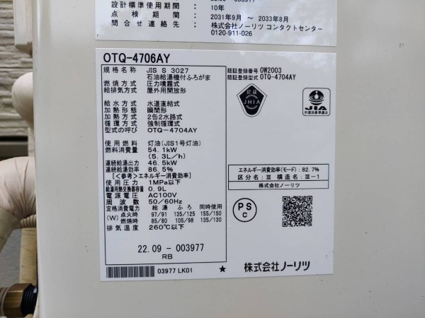 大台町 ノーリツ石油給湯機付ふろがまOTQ-4706AY 給湯器交換工事