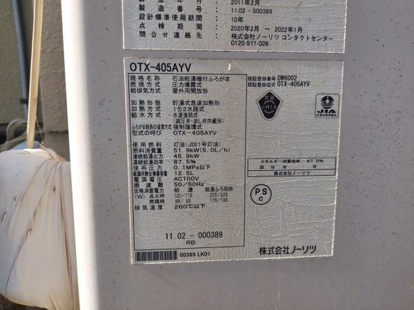 熊野市 ノーリツ給湯器OTX-405AYV→ノーリツ石油給湯機付ふろがまOTQ-4706AY 給湯器交換工事