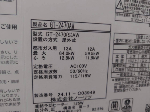 春日井市篠木町 ノーリツ給湯器GT-2470AW 給湯器交換工事